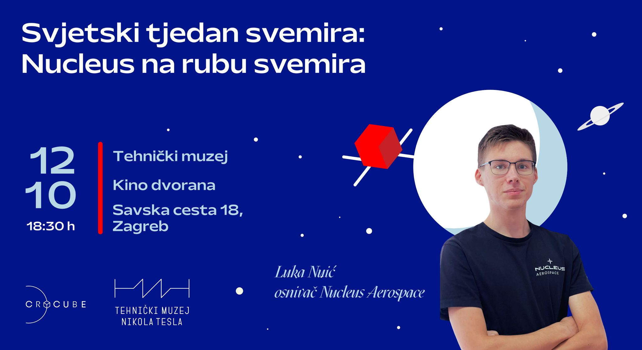 16. listopada 2024. Nucleus na rubu svemira – Luka Nuić na Svjetskom tjednu svemira Svjetski tjedan svemira 2024., održan u organizaciji Tehničkog muzeja Nikola Tesla i CroCube-a, okupio je vodeće